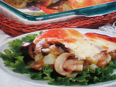 Лук спассеруйте на топленом масле 3 минуты, затем добавьте курицу и жарьте, помешивая, 5-7 минут. Добавьте грибы и обжаривайте все вместе еще 10 мин. Посолите, поперчите.